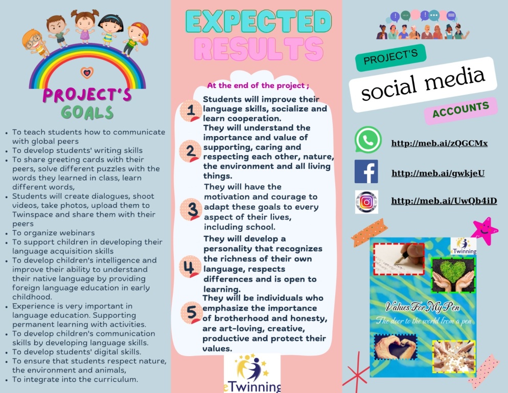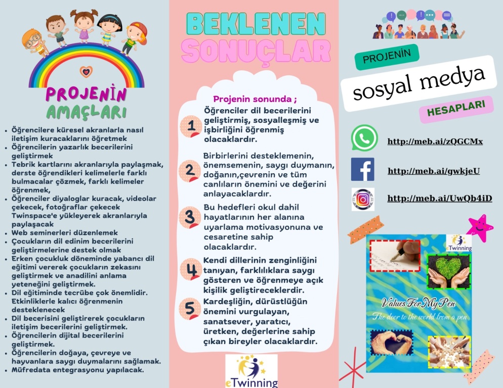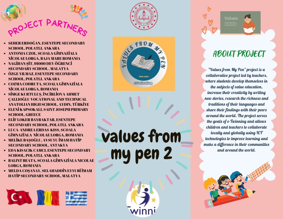 İngilizce Öğretmenimiz Nagihan ŞİT'in yürüttüğü "Values From My Pen 2" isimli e twinning projesinin broşürünü öğretmenimiz öğrencileriyle beraber hazırladı.